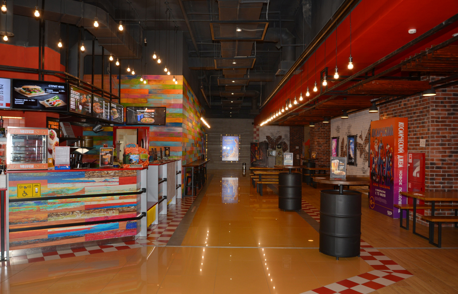 Яркий дизайн создаёт приятную обстановку и отличное настроение. Просторное фойе со стильными столиками в зоне Street Food Bar и уютные диванчики помогут приятно провести время во время ожидания сеанса. Экраны в фойе ненавязчиво транслируют актуальное расписание и информацию о привлекательных акциях.